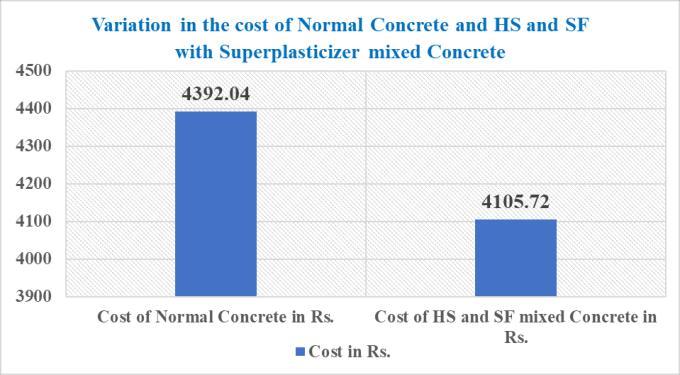 [9] After estimation of normal concrete (M 30) and the HS and SF with superplasticizer mixed concrete is found that per m3 concrete save 286.32Rs.