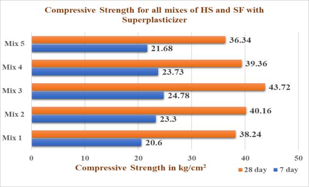 addition of HS and 1% addition of SF in the amount of 43.72 kg/cm2, but after that it starts reducing the compressive strength with an increaseofHSand SFadditionandthe mix which givesthemaximumcompressivestrengthisMix3.