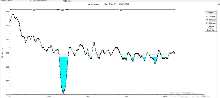Above graphical representation shows water profile of cross section on Krishna River. The station number of cross section is 30009 that mean it is situated at upstream.Inthis cross section water profile iscreated by a flood of 100 year return period. From the figure it is observed that the banks are overtopped. The maximum watersurfaceelevationisfoundtobe568.57m.