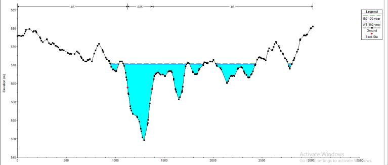 a flood of 100 year return period. From the figure it is observed that the banks are overtopped. The maximum watersurfaceelevationisfoundtobe570.04m.