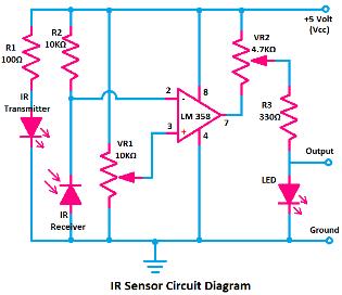 IntwoLEDsoneLEDfunctionastransmitterandanotheras receiver. The resisters used in the circuit diagram of IR sensorsareintherangeofKiloohms.TheIRsensorconsists ofthreepins(VCC,GNDandOutput).