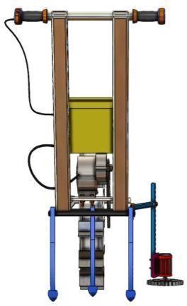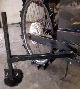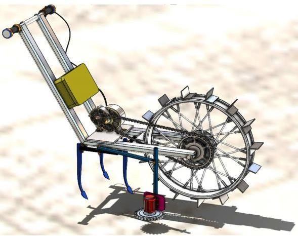Themachinemakesuseofabikewheelrimwith welded angles to provide efficient gripping on agriculture soil. The wheel rim design is developed to provide a firm grippingonagriculturelandstrongsufficienttodragthetiller machinebladewhiletillingprocess.Aswitchisprovidedon the right side of handle is used to switch on or off the machine.Themachineisrunbyanelectrichubmotorwhich usesachainandsprocketmechanismarrangementtorunthe pullingbikewheelrim.
