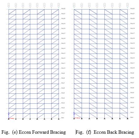 A software package ETABS SOFTWARE is using for the analysis of steel buildings and different parameters are compared The property of the section is used as per IS 800:2007 which is analysis for various types of bracingslikeX, V, inverted V, Eccen Forward, Eccen Back andwithoutbracing and Performance of each frame is carried out and studied the comparatively through Response Spectrum Method