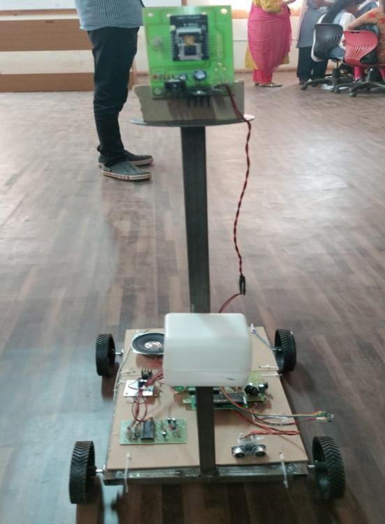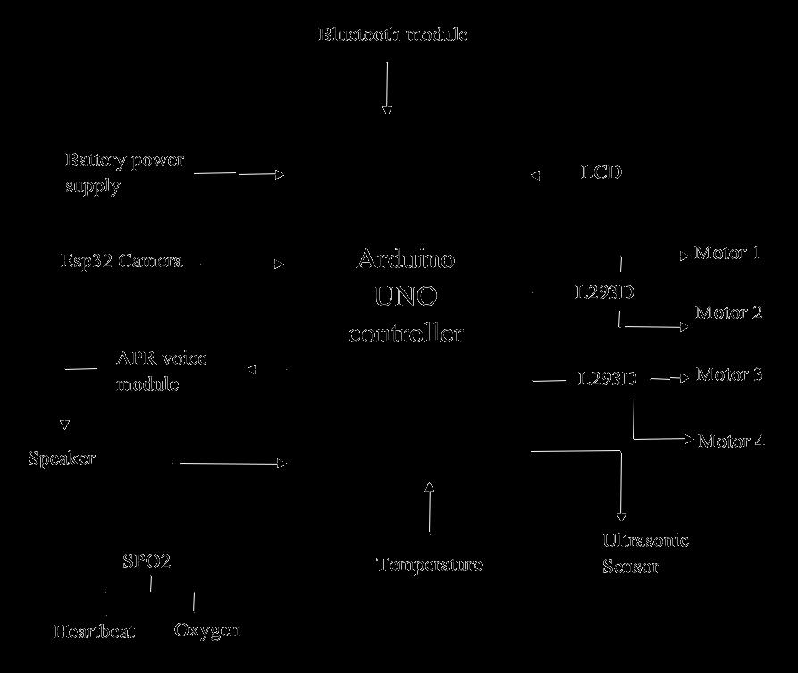 The major component of the Robot is Arduino UNO controllerwhichrunsonbatterypowersupply,thatastobe charged, whenever it gets discharge. It consists of Esp32 Camerawhichisusedtoseetherealtimesituation.Therobot havingfourwheelsiscontrolledusingcommandsbywhichit canmovearoundthepatients,robotiscontrolledbydoctor bymonitoringonthescreenusingEsp32camera.Itconsists ofARPvoicemodulethroughwhichspeakerisconnectedto therobot,itconsistsofthreevoicecommands.Itconsistsof SPO2 (heartbeat & Oxygen)sensor ad temperaturesensor whentouchedthevaluesaresensedaddisplayedonLCD.The fourwheelsarecontrolledusingmotorswhichareconnected