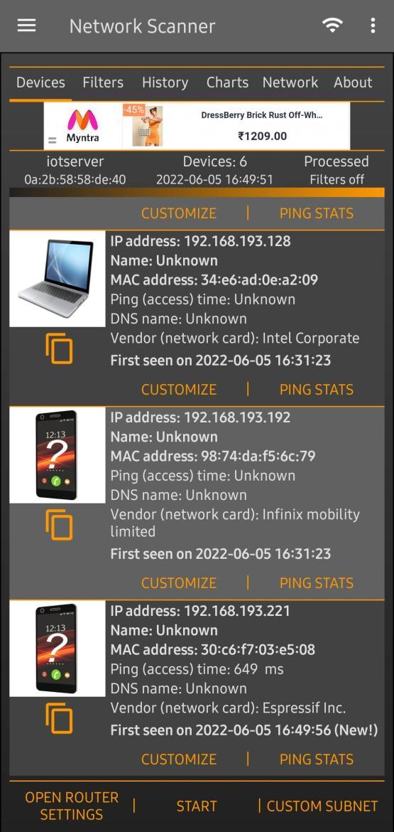 II. On the mobile Wi Fi/router connection such that thecammodulewillconnecttotheinternetandits IPaddressisfoundedbyusingNetworkscannerIP scannerapp,byfindingisvendornameasespressif Inc.noteitsIPaddress.