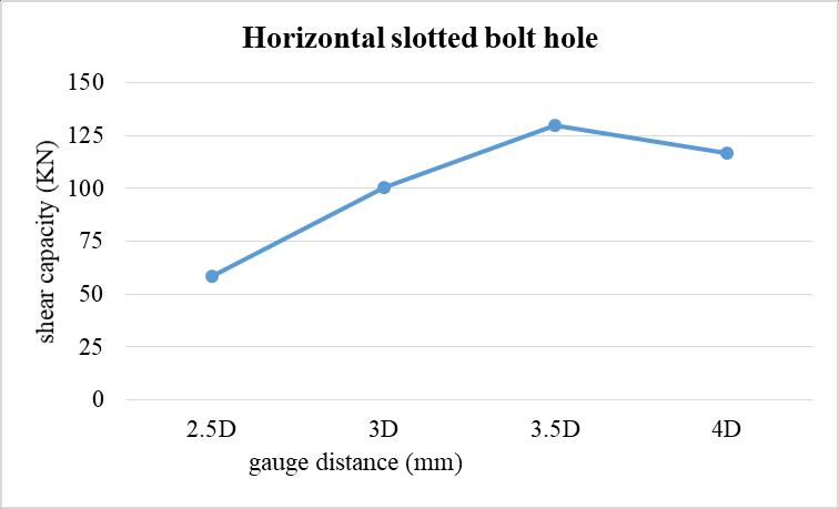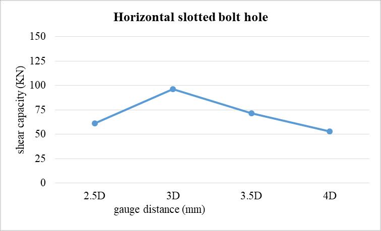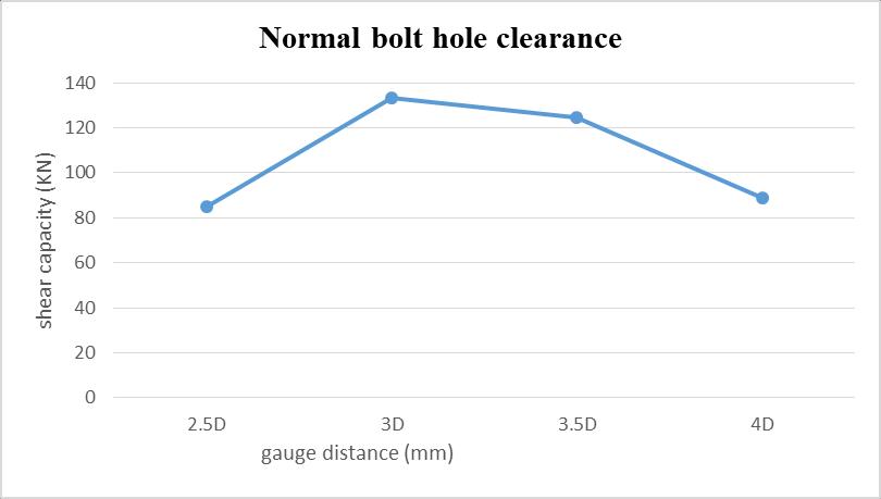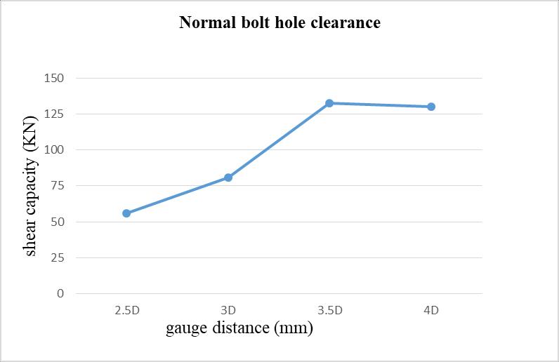 The above graph shows that, while increasing the gauge distance from 2.5 times the bolt diameter (D), the shear capacityoftheboltedconnectionincreasesfrom79.675KN to113.54 KN.Forfurtherincrementofgaugedistancethe shear capacity slightly falls down to 88.24 KN. While comparedwiththenormalboltholeclearancethemaximum valueobtainedat3D.
