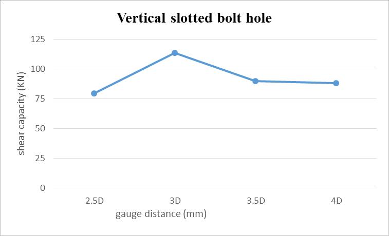 The above graph shows that, while increasing the gauge distance from 2.5 times the bolt diameter (D), the shear capacityoftheboltedconnectionincreasesfrom85.12KNto 133.48 KN. For further increment of gauge distance the shearcapacityslightlyfallsdown.Whenthegaugedistance cross3Dto4Dtheshearcapacityvalueslightlyfallsdown.