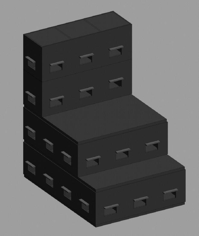 A modular geometry system was derived based on an elementary cube(5x5x5m): To generate different building shapes, such elements were used. These elements were aggregated in different ways to create 70 morphological variationsamongwhichninewereselectedonthebasisof geometric index and relative compactness. The "relative compactness" (RC) indicator was employed to define compactness.TheRCofashapeisderivedinthatitsvolume tosurface ration iscomparedto thatof themostcompact shapewithsamevolume.