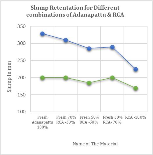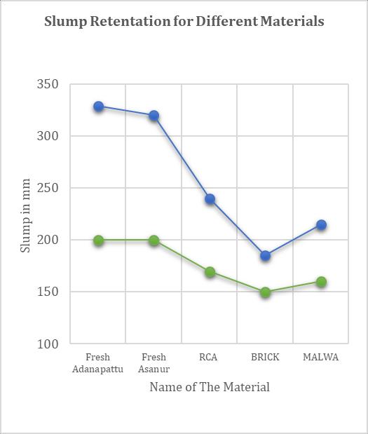 The retention of workability / slump was also recorded for 60 minutes. The details of observations for three broad classifications are given in tables 5, 6 & 7. Variationinslumpvaluefor5basicmaterialsinitiallyand after 60 minutesisshowninfigure6.Itisseen, thateven after60minutestheconcreteremainsworkableforRecycled aggregatesincludingMALWA