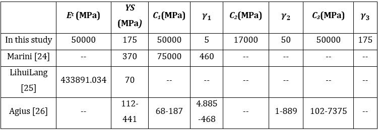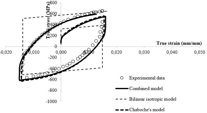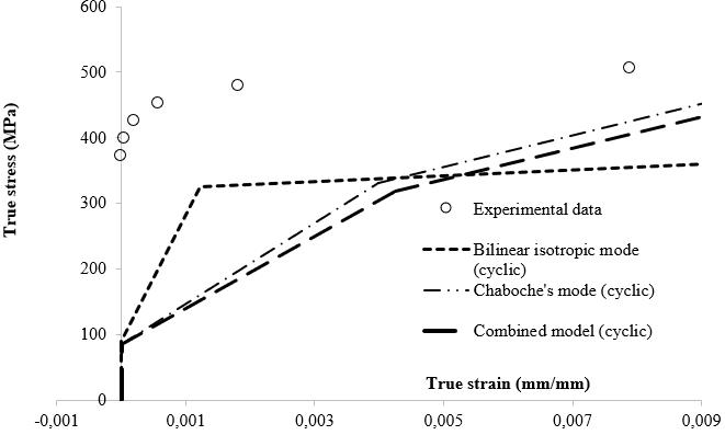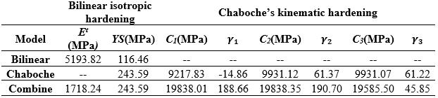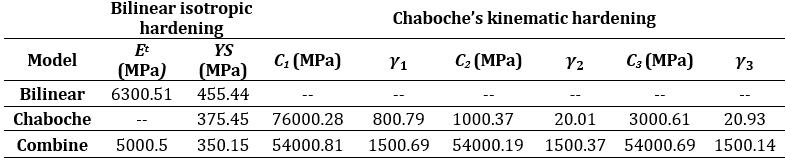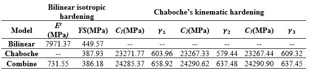 As a result of the nonlinear regression process, the yield strength of the bilinear isotropic hardening model was obtainedbyusing YS andtangentmodulus Et and YS, Cm, γm parameters found in the Chaboche equation. Yield values (YS)inbothmodelsarecommon.Inthisstudy,athree term Chabocheequationwasused.