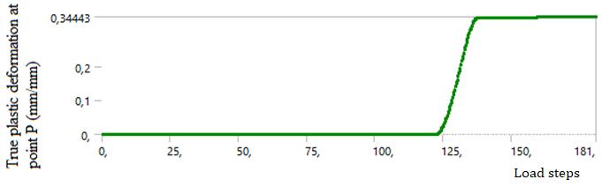 Figure 7. (a) The combination of bilinear isotropic and Chabochekinematicmodelresultsindeformationatthelast stageinthexdirection(b)displacementatpointP(c)actual plasticdeformationofpointP