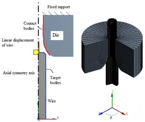 Thewiremovesintothemoldbymovinginthe+ y direction, asindicatedinFigure6b.Atotaldisplacementof90.5mm wasdefined.Itisimportanttonoteherethatthelengthof thewirewillbeshorterasthelengthwillbeshortened.The model is confirmed by comparing the experimentally measuredandestimatedvaluesofthediameterofthedrawn wire. It is then used as input data for the next step, the optimizationprocess,tocalibratethematerialparametersto givetheclosestresulttotheexperimentalvalue.