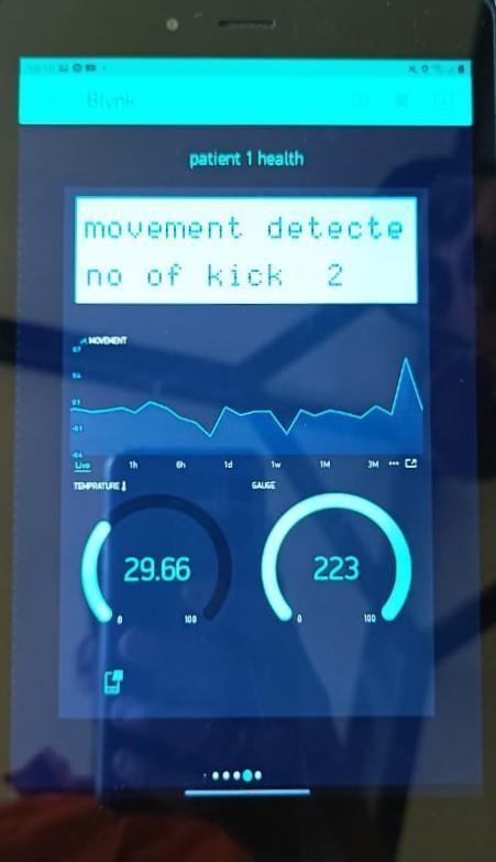 TheabovedevelopedprototypemodelisgoingtodetectthefetusmomentsandkicksWiththehelpof accelerometersensor and gyroscopic, and also detect the heart beat and temperature of the mother using heart beat sensor and temperature sensor.Theresultsfromtheabovesensorsaretransferredtothecloud,through thesereadingswecanobtainthenumberof fetalkicksandit’sgraph,alsothetemperatureofthemotheralong withtheheartbeat.Fromtheseresultswecanavoidthe fetalandmotherdeath’sinruralareasandimprovethehealthmonitoringsystemintheruralareas.