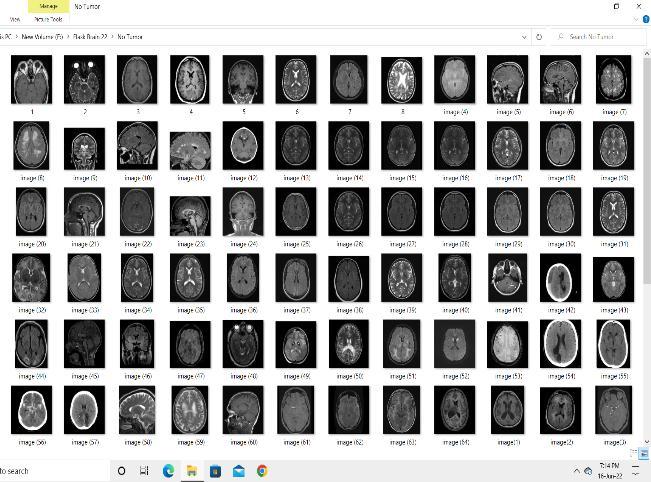 MRIimagesarethesourceofinputforourProject.Thebrain MRIimagesarecollectedfromvarioushospitals.Thedata required for the training is MRI images containing Tumor and Non Tumor MRI images. The MRI images pixel range from0 255.The0canbeconsideredaswhiteand255canbe considered as Black. Here we have attached some of the datasetsimagesconsistingofTumorandNon Tumor.