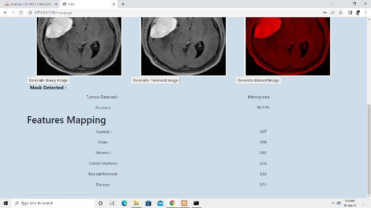 Thebrainisthemostsignificantanddelicateportionofthe humanbody,whichismadeupofvarioussections(organs). Abnormalcelldevelopmentwithinthebrainistheprimary causeofbraincancer.Currently,doctorsidentifythetumour location by looking at the MRI (Magnetic Resonance Imaging)manually.Thesepredictionsarenotveryaccurate, so to avoid this problem, there is software that works on using MRI images of the brain and image processing techniques to detect brain cancer. This software not just detects the tumour but also identifies the types of brain tumours like Glioma, Meningioma, and Pituitary. This will helpthedoctortogivethepropertreatmenttopatientsatan earlier stage. This software provides better security by allowing only authorized users to access this software, so thatthepatient'sdetailsarenotavailabletounauthorized persons.Thismodelconsistsofsixsteps.imageacquisition, image pre processing. Image Segmentation, Feature Extraction,FeatureComparison,andResults.Thissoftware displays the masked image of the brain tumour by highlightingthetumourlocation.Thissoftwarealsodisplays the features of the tumour like kurtosis, order, moment, centermoment,normalmoment,andentropy.Wehaveused theMaskRCNNalgorithmtodetectbraincancer.MaskRCNN isapopulardeeplearningnetworkinthecomputervision field,forinstance,segmentation.Deeplearningalgorithms givemoreaccuracywhencomparedtootheralgorithms.