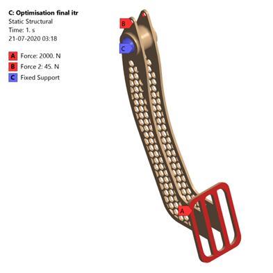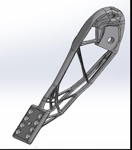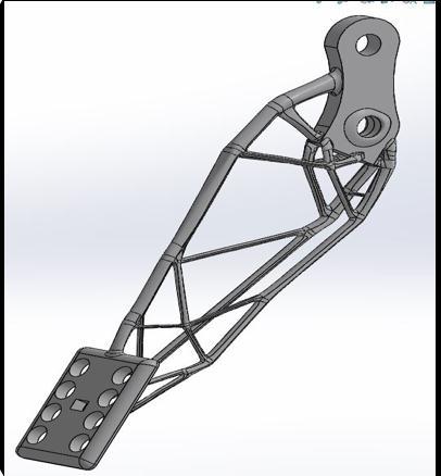 TheoptimisedCADmodelofthebrakepedalhasbeencreatedinPTCCreoParametric5.0.Itconsistsofmountingpointsfor itselfand2mastercylinders.TheDesignspacehasbeenoptimisedwithahexagonallatticestructureforweightreduction. OptimisedCADmodelofthebrakepedalisshowninFig*\