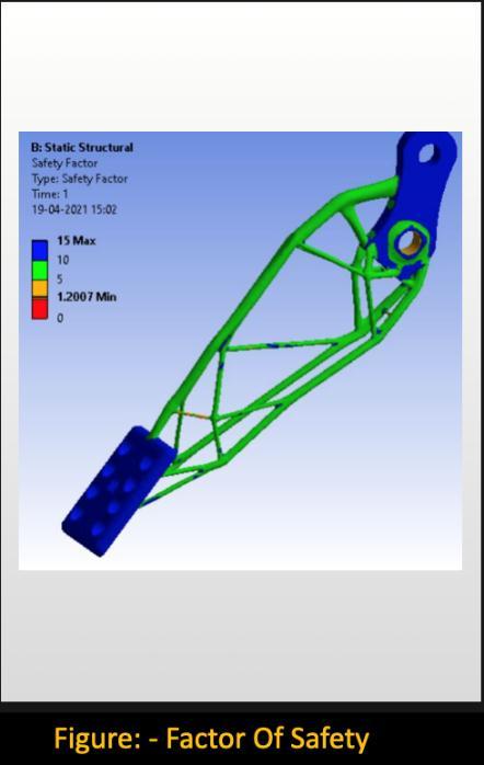 1.Uponcomparisonitwasobservedthatthedesign2ofGenerativedesignModelhasthehighestfactorofsafetyforsimilar working conditionsi.e."2.6257" and weight of the brake pedal was reduced from "256 grams" to "122 grams" which is "52.34%"weightreduction.