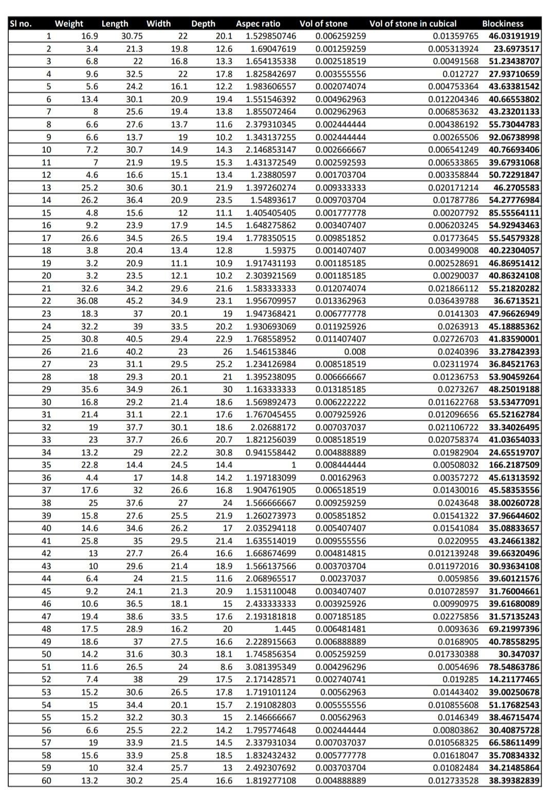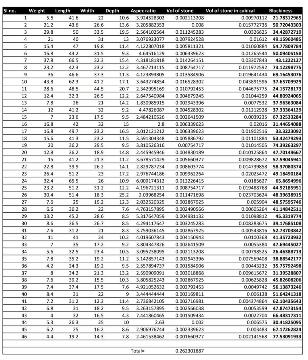 Usingtheobtaineddata’swewereabletocalculatethevolumeofthefrustumsection.Eachstonefromtheembankmentwere taken out to measure it’s weight and dimensions(length,breadth,depth).These readings were noted down. Using these readings,wecalculatedtheaspectratio(AspectRatio=(L/D)andblockiness(BL=[Vstone/Vcubical]x100)ofeachstone.