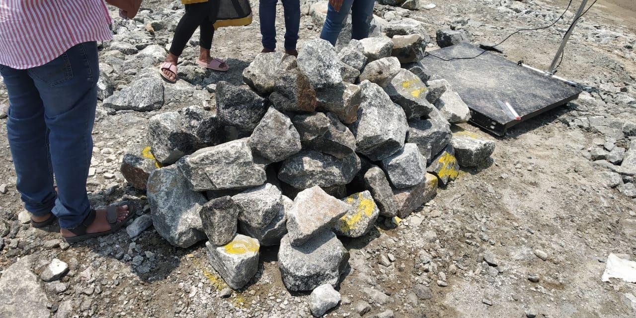 Using the obtained data’s we were able to calculate the volume of the frustum section. One by one each stone from the embankment were taken out to measure it’s weight and dimensions(length,bredth,depth).These readings were noted down. Usingthesereadings wecalculatedtheaspectratio(AspectRatio=(L/D) andblockiness (BL=[Vstone/Vcubical]x100)ofeach stone