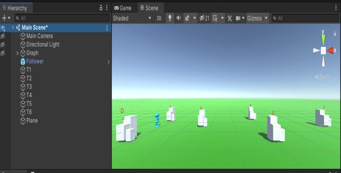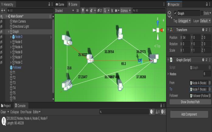 The Dijkstra algorithm is also referred to as a single source shortest path algorithm. The single source means thatonlyonesource(start node) isgiven,and wehave to find the path with lowest distance from the start node to allthenodes.(javatpoint,2017)[11] Fig 10: Unity interface with 3D game objects