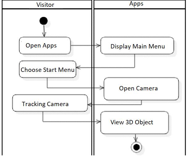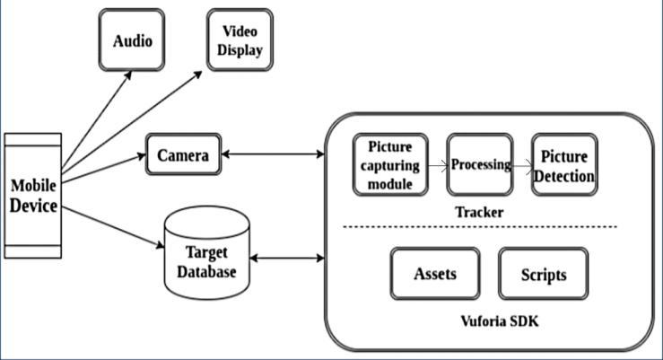 This application is developed by using Unity3d and Vuforia Augmented Reality Software Development Key (ARSDK). Here Unity3D is used to create the application andVuforiaARSDKisusedtolinktheAugmentedReality camera and the image tracker. Tracker is used to detect the image target which is stored in the database. Assets and Scripts working along with access to the Target Database is explained in detail in the same section after describingthemodel.AsshowninFigure2,thefirststepis to open the application camera and scan the targeted imageusingamobiledevice.Oncetheimageisscanned,it is sent to the picture capturing model for recognition. If theimageisrecognizeditissenttotheprocessingmodel. Processing model then detects the marker position and sends it to the tracker model. Tracker model then identifiesthemarkerandsendsittotherenderingmodel. Rendering a model using picture detection will mark a virtual object to the marker and hence the augmented videowillbeplayed.