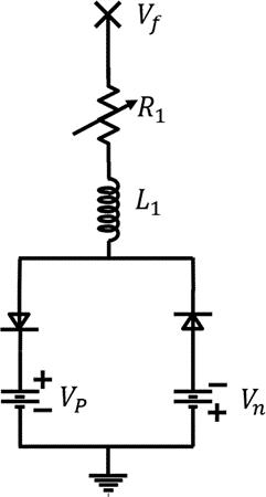 Emanuel et al. [46] presented an additional model to emulate the unique propertiesof an HIF.Asindicatedin Figure 4, R1 and R2 contribute the nonlinearity dimension to the HIF, while Vp and Vn factor in the incident's discharged arcing voltage. This model is built withdirecteddiodessothatthefaultcurrentflowsfrom the source to the ground if Vf>Vp. The opposite will occur at Vf <Vn, as current will flow back to the source, andnocurrentwillflowintothesystemwhenVn<Vf<Vp. Figure 5 shows how other researchers in [47 50] expandedonEmanuel'sconceptbyexperimentingwitha variableresistor.Thismodel,however,lacksthecapacity tosimulate.