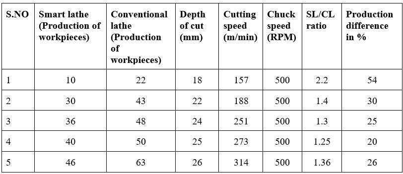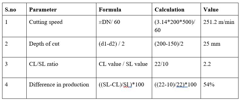 Theabovetable3showsthecalculationsoftheworkpiece beforeandafterthe machining.A25mmdepth ofcutwas given to the specimen, and there was a huge difference in productionquantityfromtwolathes.