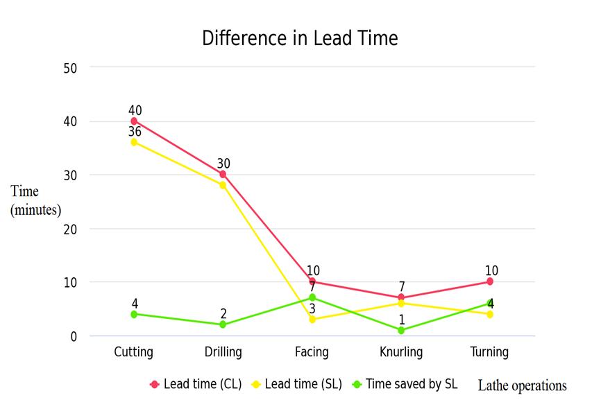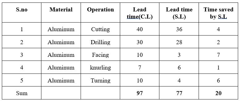 Whenusingthelathemachinetoperformtaskslikecutting, drilling, facing, knurling, and turning, an aluminum workpiece is taken into account. When comparing a conventionallatheandasmartlathe,thetimerequiredfor theseoperationsisnotedasthetimedifference. Thesmart lathemachinesaves20minutesasshownintable1.when compared to a conventional lathe when performing all 5 operations, which takes 97 minutes as opposed to 77 minutes.