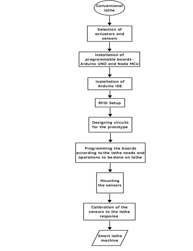 Thefig1showstheconversionofaconventionallatheintoa smart lathe in different stages. There are different stages, from selecting the sensors to programming them and implementingthemonthelathemachine.
