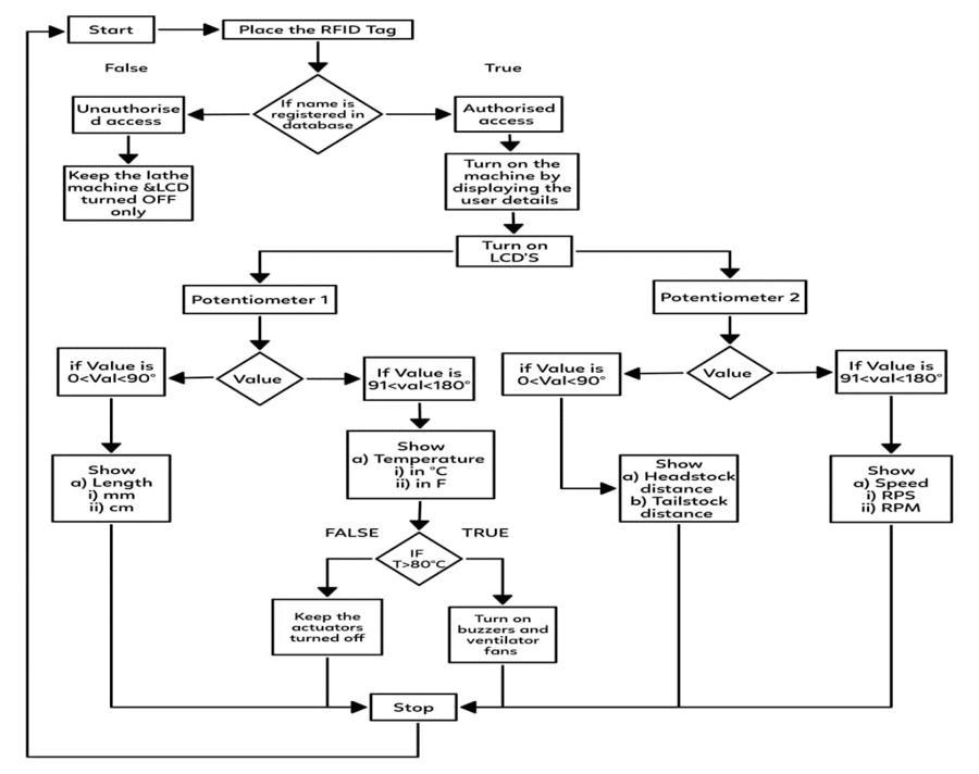 Due to inadequate training, if someone uses the lathe machine without authorization, they run the risk of damagingitorbecominginjured.Whentheusergainsaccess tothemachine,theLCDwillturnonanddisplaydatafrom various sensors, including temperature, spindle speed, workpiecelength,anddistancesbetweentheheadstockand tailstock. The lathe machine continues to perform all the tasks while it is in use and becomes heated. When the machine's motor reaches a temperature of more than 80 degrees Celsius, it automatically shuts off and sounds a buzzer to let the user know how things are going. The ventilatorsarealsoactivatedatthattime.