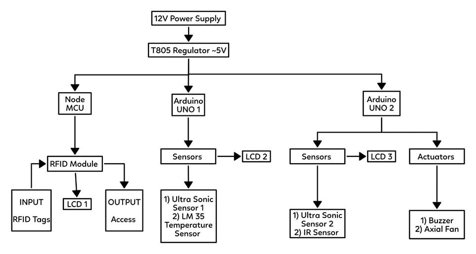 Thefig2,blockdiagram,explainsthedifferentsensorsand actuatorsconnectedtotheprogrammableboardssuchasthe Arduino UNO and NodeMCU. The actuators still require a 12Vpowersourceeventhoughalltheelectronicpartsare connected to 5V. The microcontroller gathers the sensor dataandusestheI2Ccommunicationprotocoltosenditto theLCD.AnInternetofThings(IoT)devicecalledNodeMCU cansenddatainformatsthatarereadablebyhumansover Wi Fi.[2]