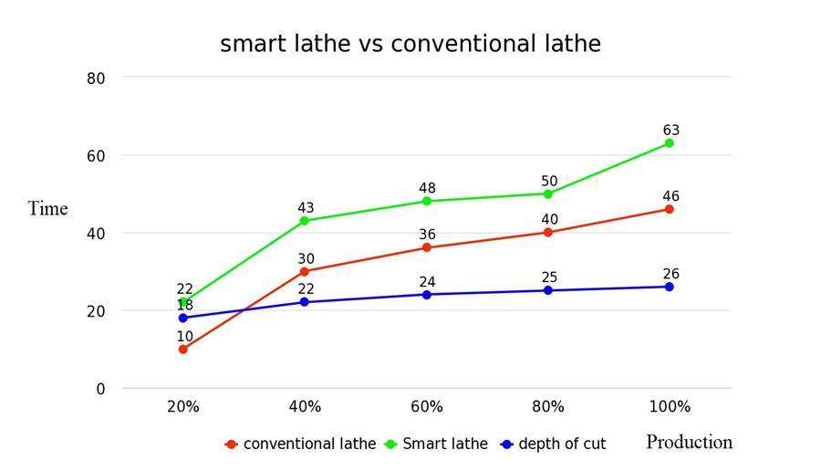 Thegreenlineinthefig12showshowmuchtimethesmart lathemachinesaveswhenperformingthesameoperations compared to the conventional lathe machine. The smart lathehassaved20minutesinthepreparationofaworkpiece basedonfiveoperations.