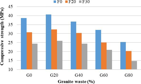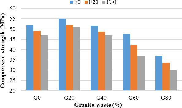 However,thelossincompressivestrengthreduced asthecuringdayswereprolonged.Forexample,the 7 daycompressivestrengthvaluesoftheG0F30mix reduced by 37.08% compared to the G0F0 mix, whereas the 28 day strength values of the G0F30 mixreducedbyonly9.62%comparedtotheG0F0 mix.