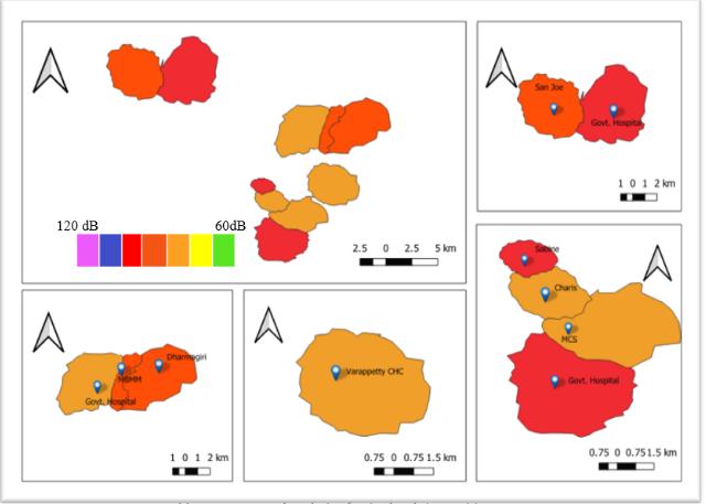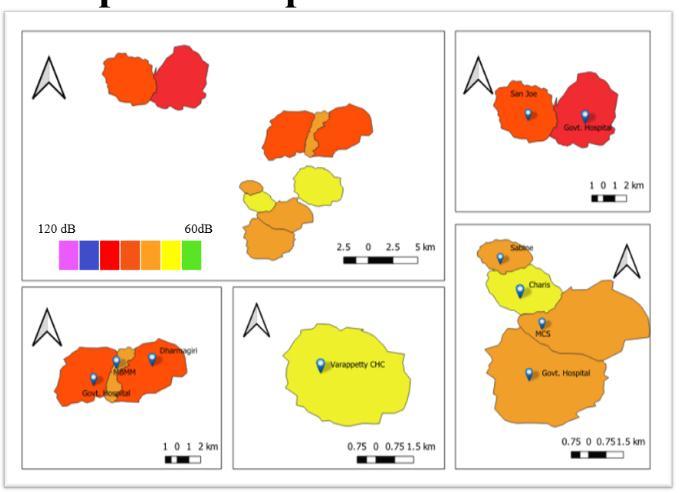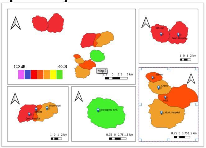 Infig3,4,5,6,7,8,9,10showsthenoisemapof10hospitalson workingdaysandnonworkingintimeinterval8 10,10 12,2 4,4 6.Fromthemapitselfwecanunderstandthatthenoise levelthatwemeasuredatthesensitivezonearehigherthan theCPCBstandards.