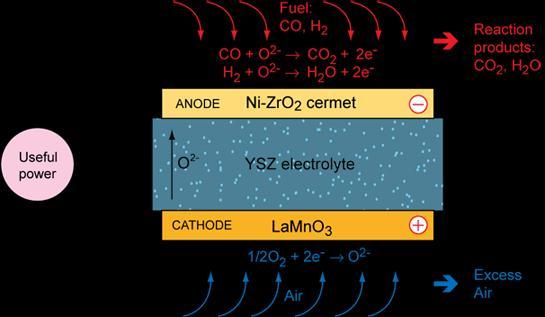 InSOFCstacktheyttriumstabilizedzirconiahasbeenusedasasolidelectrolytewhichenablesoxygenion conduction while blocking the electronic conduction. To achieve the sufficient ion conduction, an SOFC with a YSZ electrolyte must be operatedathightemperaturebetween800oC 1000oC,themainadvantageofusingSOFCisitscheapoperatingcostandthe cheap electrolyte used the efficiency of SOFC is around 60 65% the commercial manufacturer of SOFC stack is bloom energy[31]