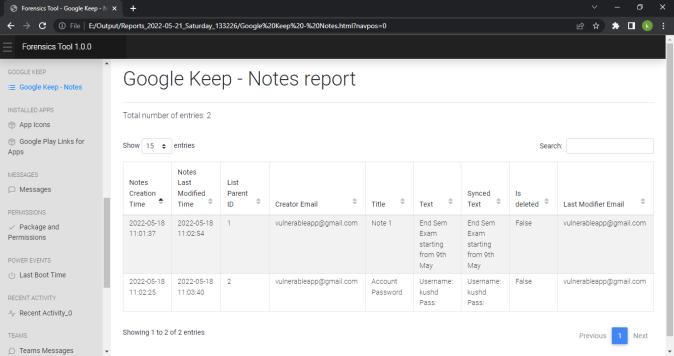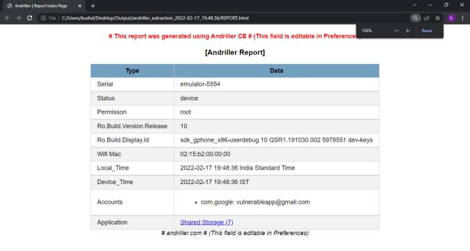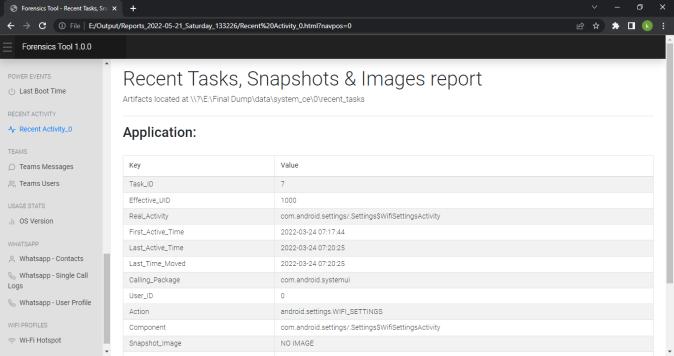 We can view the report generated in any web browser window. Following screenshot shows the index pageofthereport.Reportisdividedindifferenttabsbased onartifactsandwecannavigatetoeachartifactreport by clickingontheartifactname.