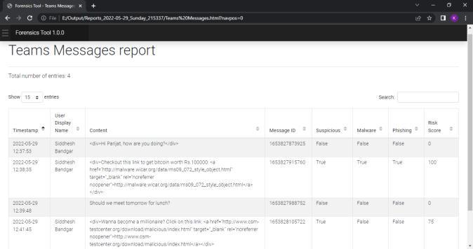 Output : Teams_messages, Teams_user, Teams_call logs, Teams_activity feed,Teams_file info