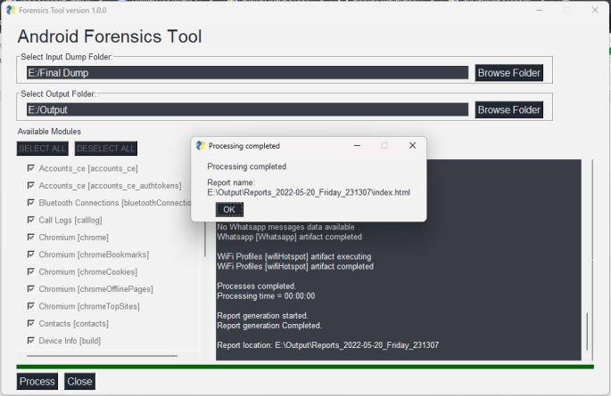 Step4:Afterforensicanalysisprocessingiscompletedwe get the pop up window indicating processing complete messageandreportfilenameandpath.ClicktheOKbutton wecanseethereportinthebrowser.