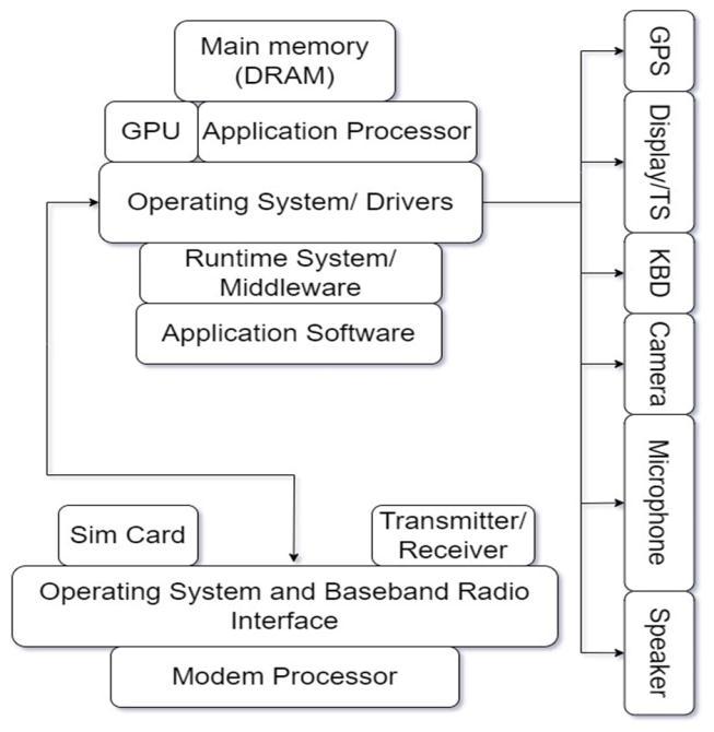 Themainusecaseofasmartphoneistoexecuteapplication software. The software gets executed with the help of an application processor often taking help from a graphics processor for rendering scenes and whenever the applicationprocessorofthegraphicsprocessorneedsdatait will access the main memory which is dynamic random accessmemory.Betweentheapplicationsoftwareandthe application processor sit two elements one is the drivers thatarenecessaryforhandlingvarioustypesofI/Ocallsand aruntimesystemorthemiddlelayerwhichtheapplication software takes help off to execute various types of application programs[2]. The I/O devices present are for example the Global Positioning System, Display and the Touchscreen,Keyboard,Camera,Microphone,Speakerand soon.Thecommunicationishandledbyamodemprocessor which receives all the signals and passes them on to the operating system and the baseband radio interface. The radio interface communicates with the transmitter and receiverandalsotheSIMcard.Thetwodifferentoperating systems residing on the application processor and the modernprocessorusuallycommunicatewitheachotherfor handlingdatacommunicationbetweenthesetwomodules.