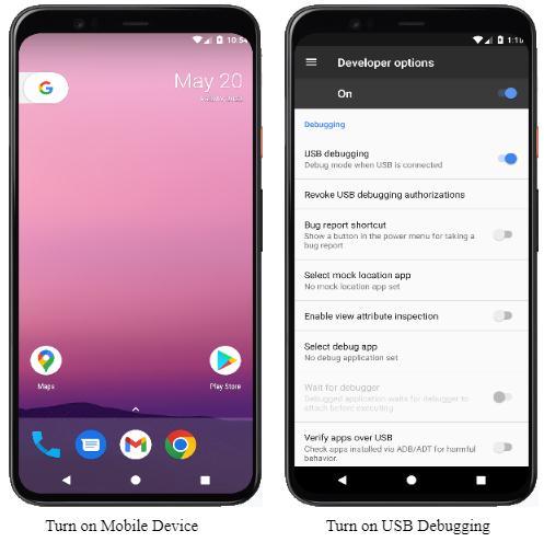 Step1:TurnontheAndroiddeviceor emulator.Connectthe mobiledevicetothecomputerusingUSBandturnonUSB debugginginthesettings.