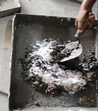 Fig. 1: Mixing of shredded waste plastic with concrete