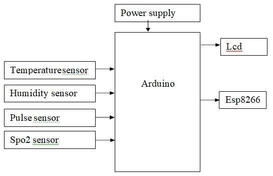 Therequiredhardwarecomponentsare:ArduinoUno,16X2 LCD display, GSM module, temperature sensor(LM35), Esp8266,pulsesensor.