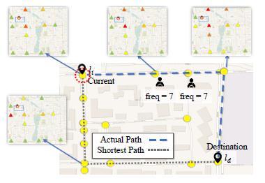 With the availability of user generated trajectory information, route recommendation has received much attentionfromthe research community [3],whichaimsto generate reachable paths between the source and destination locaions. The task can be defined as either personalized [5] or no personalized [8], and constructed based on different types of trajectory data, e.g., GPS data [6]or POI check in data. In the literature, various algorithms have been developed for route