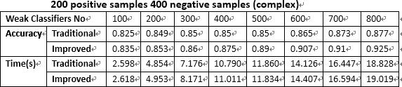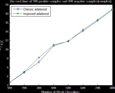 It isalso seen from the graph that the accuracy of the improvedAdaBoostalgorithmisincreasingswiftlywhereas for traditional AdaBoost algorithm the accuracy remains unchanged for the number of weak classifiers 200 500. Whenitis500,thegreatestcontrastintheaccuracyisseen. TheaccuracyofthetraditionalAdaBoostalgorithmisseen tobe4%lessthantheimprovedAdaBoostalgorithm.Incan beobservedthatboththealgorithmhavealmostthesame costtime.InthetraditionalAdaBoostalgorithm,about700 weak classifiers have to be trained and the cost time is 16.4470seconds, however in the improved AdaBoost algorithmonly400weakclassifiersneedtobetrainedand