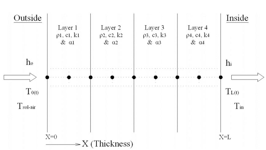Where,kisthermalconductivity,ρisthedensity and cp is the specific heat of the building materials. Two boundaryconditionandoneinitialconditionisnecessary to be specified. Convective boundary condition on both insideandoutsidesurfaceofthewallarepresent(C,etal., 2013). Theboundaryconditionatinsidesurfaceisgiven by,