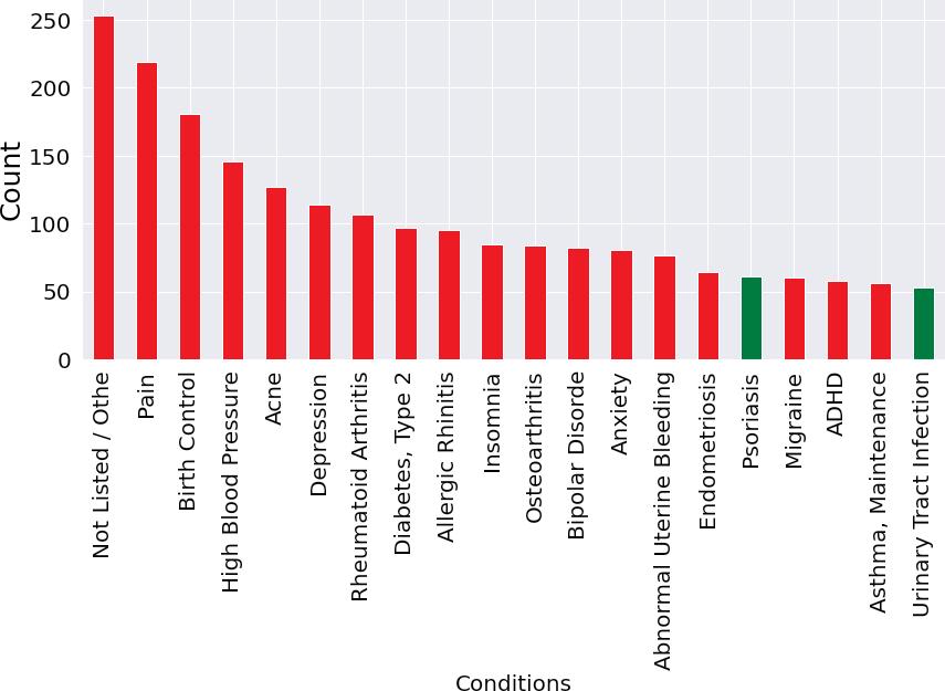 In figure 2 we can see top 20 medical conditions with the greatestnumberoftreatmentoptions.Onefactortoobserve inthisfigureisthattherearetwogreenbars,whichindicate thecriteriathathavelittlesignificance.