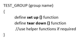 The setup () and teardown () routines must be specified insidetheTEST_GROUP(GroupName)intheCppUTestTest, even though each group includes several test cases, one setup, and one takedown. In terms of framework organization,CppUTestandUnitydivergealittle.Duetothe factthateverythingisdescribedinsidethegroup,itappears morecompactthanUnity.Thetestcaseformatisasfollows inFigure3.