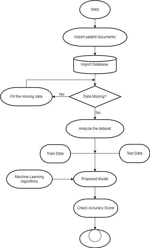 Theproposedmethodologyaimstopredictweatherthepatientissufferingfromtheheartdiseaseornot.Thisautomation helps doctorstoanalyzethecriticalconditionofthepatients.Henceitalsohelpsinimprovementoftreatments.Patientscantakemany precautionsandhelpstosavemanylives.Inthisproject,weareusingvariousalgorithmsi.e.weareimplementingbyusing hybridtechnologywithmulticlassdataset.Multiclassdatasetrepresentsvariouslevelsi.e.0,1,2,3,4.Themodelmakesuseof severalmachinelearningtechniquesandalgorithmsinanefforttoofferamorepreciseanswertotheproblem.NumerousML techniquesareusedhereonthedataset.Forinstance,theKNearestNeighborsmethod,RandomForest,LogisticRegression, GaussianNB,RegressionTree,etc.Ahybridmodeliscreatedemployingallthesetechniquesforincreasedaccuracy.Additionally, themodelworkswithpracticallyallpatientrecordtypes.Pre processingofthedatasetinvolvesreducingnoiseandoutliers.The datasethasnowbeensplitintotrainandtestdata.Datathatis75%trainedisreferredtoastraindata.Datadeemedtobetest datamakeup25%ofthetotal.Thefigure basedmethodsbelowareusedtogeneratetheMLmodels.
