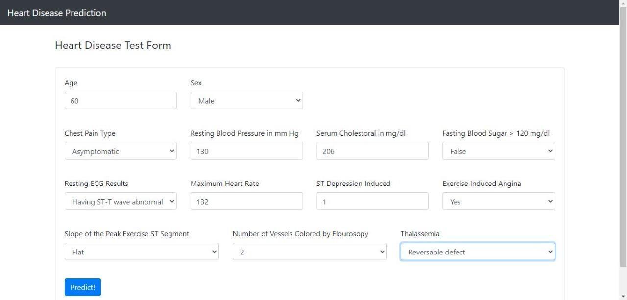 Theabovefigureistheuserinputpage.Oncetheuserlogs inintothewebsite,thenheisdirectedtothispage.Userhastoinput thedataaccordingtotheirhealthconditionsbyselectingfromthedropdownoptions.Ageisofintegertype;theuserhastoinput theageinnumbers.TheSexfiledhavetheoptionsmaleandfemale,theuserhastochooseone.TheRestingBloodPressure, SerumCholesterolinmg/dl,MaximumHeartRate,STDepressioninducedaretheintegertype;theuserhastoinputdatafromthe medicalrecordprovided.Theother fieldslikeChestpaintype,FastingBloodSugar,RestingECGResults,ExerciseInduced Angina;theuserselectoneoftheoptionsfromthedropdownmenu.