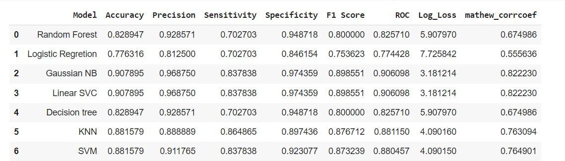 Key Words: Gaussian NB, Linear SVC, Random Forest, K Neighbours, Decision Tree, Random Forest, Arteries.